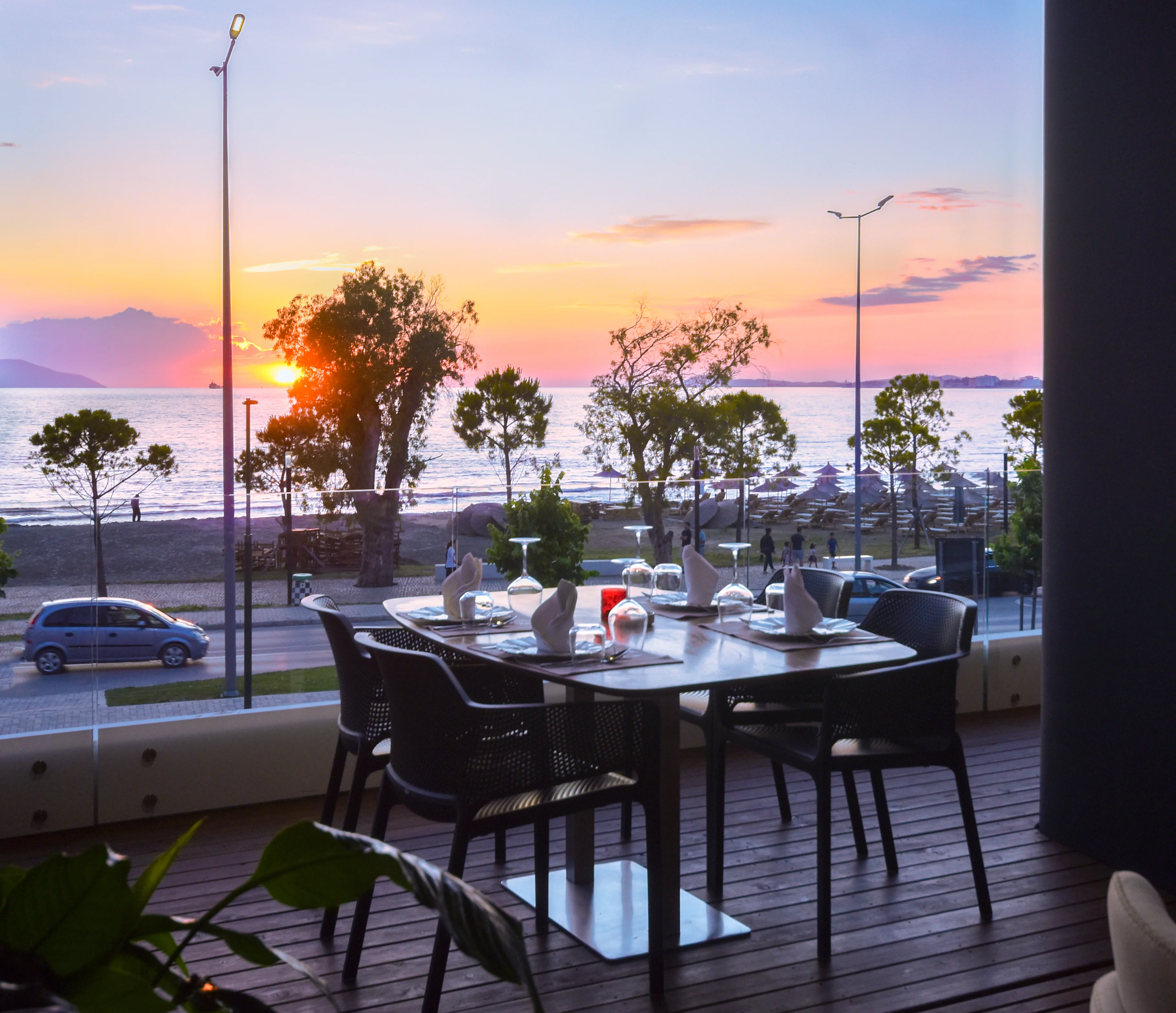 The interior and balcony indicate the hotel’s recognisable design aesthetic, providing a comfortable setting with a soothing vista of the Ioanian Sea. Breakfast is served from 8 to 10:30 am, combining classic table service and buffet options to guarantee you start the day right with delicious savoury and sweet dishes. During lunch and evening the restaurant features a menu that celebrates locality and seasonality. Don’t miss some of our local specialties like local Arapash with seafood and a glass of white Juga wine or a red Demi I Kuq… The Yacht restaurant is a cozy ambience yet modern and sophisticated with a touch of Italian and Mediterranean cuisine